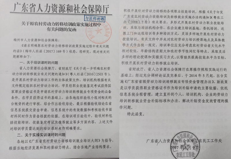 2.梅州市人社局《请求明确原农村劳动力转移培训政策实施过程中有关问题的函》(梅市人社函〔2017〕169号,复印件);