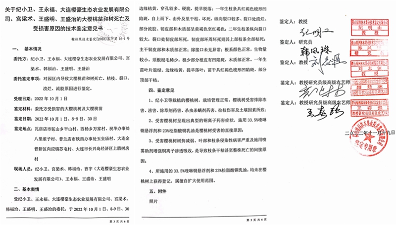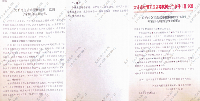 对于这些有证明力的合法证据,高兴利法官不予采信,却故意采信不合规的文件,即《关于瓦房店市樱桃树死亡原因专家综合研判意见》。这一研判意见没有任何机构盖章、没有任何专家签字,只是一张A4打印纸,毫无疑问不具有法律效力。同时,这个所谓的研判意见早已经被大连中院的生效判决否定,认定其为无效证据。详见大连市中级法院【2023】辽02民终4403号民事判决书第22页:“被上诉人(既大连殿龙公司)提交证据《关于瓦房店市樱桃树死亡原因专家综合研判意见》,用于证明2023年5月12日,针对此次瓦房店樱桃树死亡事件,大连市处置瓦房店樱桃树死亡事件工作专班在经过专家综合研判意见后,作出研判结论为:导致樱桃树枝条、根系、树干树皮受害症状的主要原因是由真菌病害引起。”但是,该判决书在第23页针对这份所谓的证据做出的认定却是:“针对被上诉人所提交的证据,因该份证据上无出具单位的印章,本院对该份证据的真实性无法确认,不予采信。”令人感到匪夷所思的是,【2023】辽02民终4403号民事判决书是在2023年7月18日做出的,并且是生效判决。而大连中级法院的另一个生效判决——【2023】辽02民终4392号民事判决书,同样否定了这份所谓的《研判意见》,该判决书做出的时间也是2023年7月18日,即高兴利做出判决两个月之前,见该判决书的第22至23页或(2023)辽0281民初261号民事判决书卷宗正卷2第173至174页。