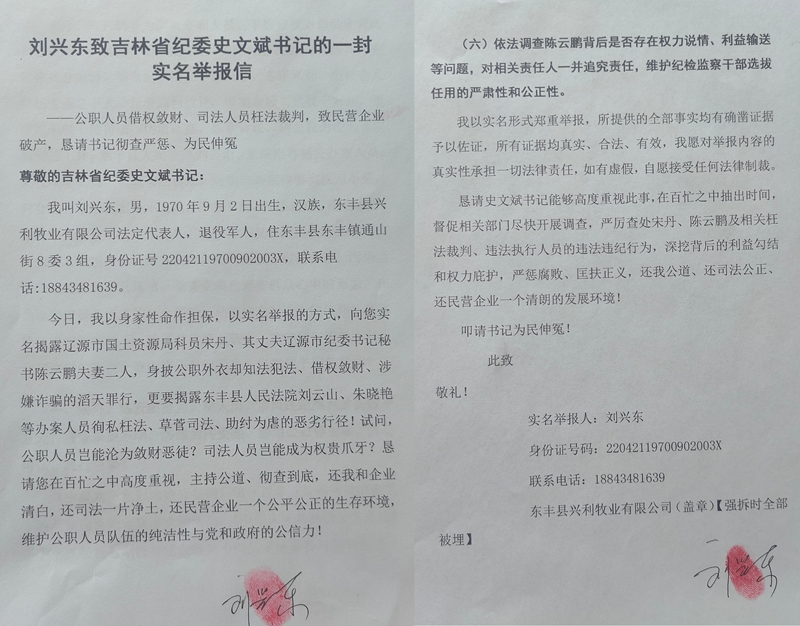 刘兴东致吉林省纪委史文斌书记的一封实名举报信 公职人员借权敛财、司法人员枉法裁判,致民营企业破产,恳请吉林省纪委彻查严惩、为民伸冤! 尊敬的吉林省纪委史文斌书记: 我叫刘兴东,男,1970年9月2日出生,汉族,吉林省东丰县兴利牧业有限公司法定代表人...