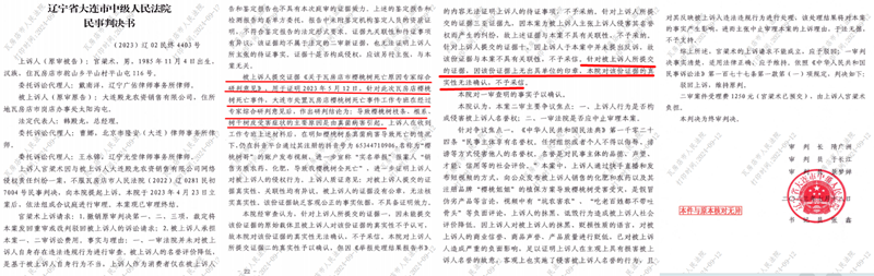 对于这些有证明力的合法证据,高兴利法官不予采信,却故意采信不合规的文件,即《关于瓦房店市樱桃树死亡原因专家综合研判意见》。这一研判意见没有任何机构盖章、没有任何专家签字,只是一张A4打印纸,毫无疑问不具有法律效力。同时,这个所谓的研判意见早已经被大连中院的生效判决否定,认定其为无效证据。详见大连市中级法院【2023】辽02民终4403号民事判决书第22页:“被上诉人(既大连殿龙公司)提交证据《关于瓦房店市樱桃树死亡原因专家综合研判意见》,用于证明2023年5月12日,针对此次瓦房店樱桃树死亡事件,大连市处置瓦房店樱桃树死亡事件工作专班在经过专家综合研判意见后,作出研判结论为:导致樱桃树枝条、根系、树干树皮受害症状的主要原因是由真菌病害引起。”但是,该判决书在第23页针对这份所谓的证据做出的认定却是:“针对被上诉人所提交的证据,因该份证据上无出具单位的印章,本院对该份证据的真实性无法确认,不予采信。”令人感到匪夷所思的是,【2023】辽02民终4403号民事判决书是在2023年7月18日做出的,并且是生效判决。而大连中级法院的另一个生效判决——【2023】辽02民终4392号民事判决书,同样否定了这份所谓的《研判意见》,该判决书做出的时间也是2023年7月18日,即高兴利做出判决两个月之前,见该判决书的第22至23页或(2023)辽0281民初261号民事判决书卷宗正卷2第173至174页。