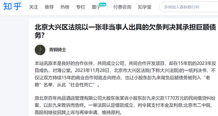 本站讯原本是良好的合作伙伴,共同成立公司,共同合作开发项目,却在15年后的2023年反目成仇,对簿公堂。2023年11月28日,北京市大兴区法院(下称大兴法院)的一纸判决书,不仅让双方持续15年的商业合作彻底走向终点,也让小股东彭九来背负巨额债务被列入老赖...