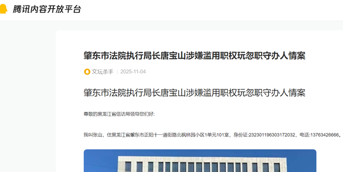 肇东市法院执行局长唐宝山涉嫌滥用职权玩忽职守办人情案 尊敬的黑龙江省信访局领导您们好: 我叫张山,住黑龙江省肇东市正阳十一道街路北枫林园小区1单元101室,身份证:232301196303172032,电话:13763426666。 事情经过: 肇东市人民法院执行局长唐宝山(电话...