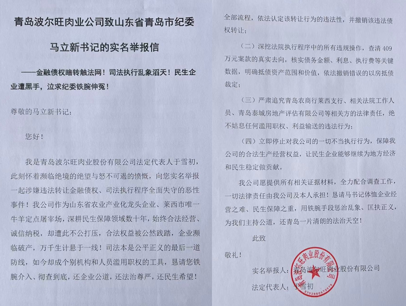 我是青岛波尔旺肉业股份有限公司法定代表人于雪初,此刻怀着濒临绝境的绝望与怒不可遏的愤慨,向您实名举报一起涉嫌违法转让金融债权、司法执行程序全面失守的恶性事件!我公司作为山东省农业产业化龙头企业、莱西市唯一牛羊定点屠宰场,深耕民生保障领域数十年,始终合法经营、诚信纳税,却遭此不公打压,合法权益被公然践踏,企业濒临破产,万千生计悬于一线!司法本是公平正义的最后一道防线,如今却成个别机构和人员滥用职权的工具,恳请您铁腕介入、彻查到底,还企业公道,还法治尊严,还民生希望!
