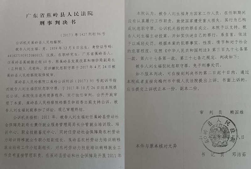2016年梅州市检察院统一布置全市农村劳动力培训工作检查,各市、县检察院在收到省人社厅复函后均自动撤案,唯独蕉岭县检察院坚持追责。更荒谬的是,梅江区人社局谢省文案与本人案件属同类范畴,谢省文因侵占挪用培训经费获罪,却未追究任何领导责任,而我仅是分管领导,竟被定玩忽职守罪!