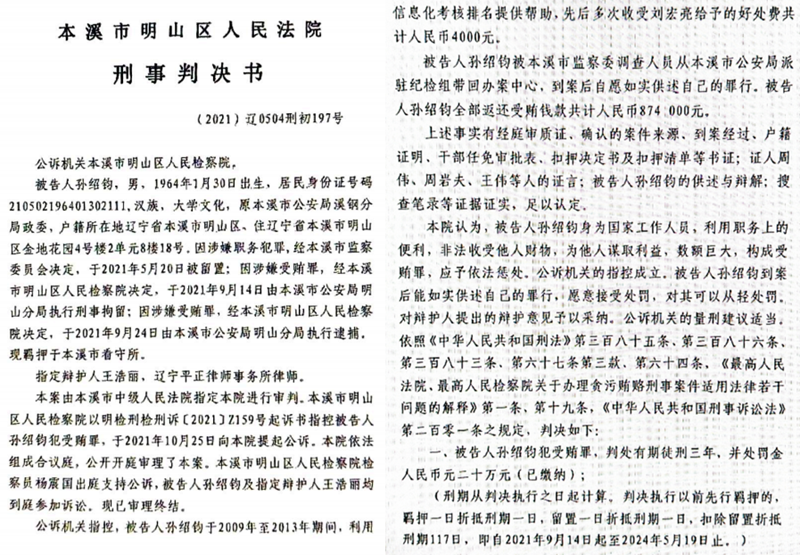 3.证据三:本溪市纪委监委对孙绍钧受贿罪的公示。