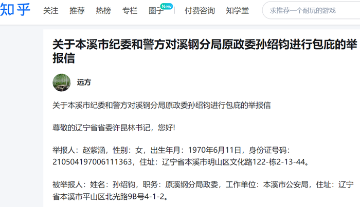 关于本溪市纪委和警方对溪钢分局原政委孙绍钧进行包庇的举报信 尊敬的辽宁省省委许昆林书记,您好! 举报人:赵紫涵,性别:女,出生年月:1970年6月11日,身份证号码:210504197006111363,住址:辽宁省本溪市明山区文化路122-栋2-13-44。 被举报人:姓名:...