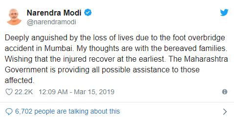在事件发生后,印度总理莫迪在推特上发文表示哀悼,并祈祷伤者早日康复。他写道,“我对孟买发生的人行桥坍塌事故中逝去的生命感到极度痛心。我的心与逝者的家人们同在。愿受伤的人能够早日康复。马哈拉施特拉邦政府正在为受害者提供一切可能的援助。”