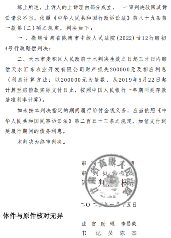 历经驳回请求、撤销判决、再驳回请求、再撤销判决后,2024年1月15日,甘肃高院判决麦积区政府赔偿汇东公司财产损失20万元及相应利息。判决依据是:参考汇东公司的陈述(曾于2019年购置11.8万棵白皮松苗大概付款十几万)、天水市林草局提供的系白皮松苗木招投标相关资料,综合考虑汇东公司与麦积区政府的责任后,酌情确定。