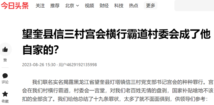 我们联名实名揭露黑龙江省望奎县灯塔镇信三村党支部书记宫会的种种罪行。宫会在我们村横行霸道,村委会一言堂,对我们老百姓无情的盘剥,国家补贴啥地不该扣的全部贪了。我们给他总结了十九条罪状,太多了就不面面俱到,供领导们参考: