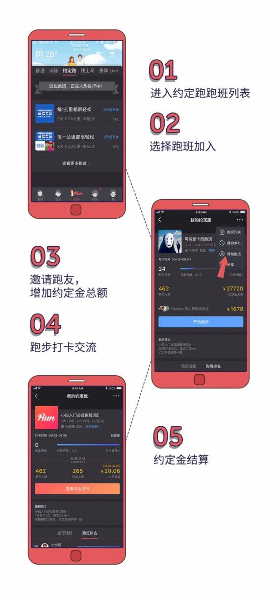 约定跑,将跑步变为跑步游戏。提高用户跑步动机的同时降低跑步能力要求,任意用户都可以创建跑班,邀请好友参与,通过约定金激励大家跑起来,完成约定者还能瓜分奖励金。同时,约定跑专注打磨工具属性,还加入有奖有罚的玩法,让跑步更有趣,让跑友坚持跑下去。