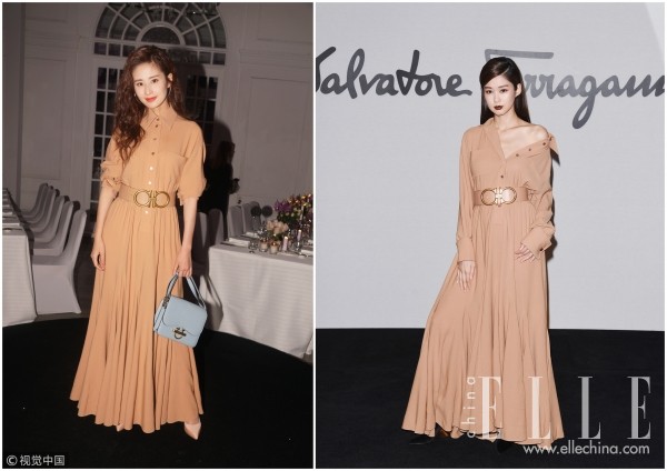 颖儿将这条Salvatore Ferragamo卡其色衬衫裙穿出“刚柔并济”的既视感,将衬衫与百褶裙巧妙地合二为一,搭配宽腰带既能打造高腰感又让衬衫裙更加贴身,营造出邻家女孩儿的亲切。 岑丽香的斜肩穿法搭配“中毒妆容”赋予了这条裙子新的时尚意义,甜美酷帅就是如此吧!